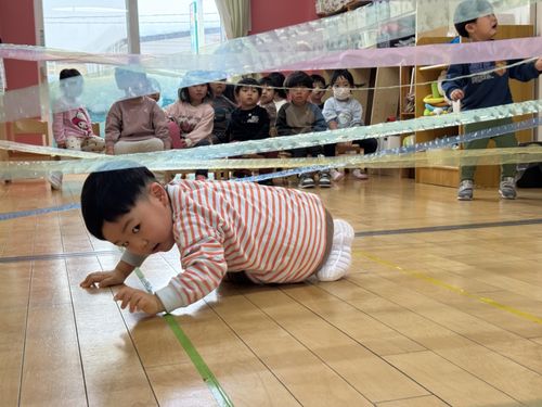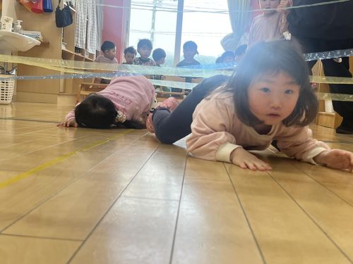 こわーいと言いながら、ジャンプ、はいはい、ほふく前進など、頭と体をつかって当たらないように