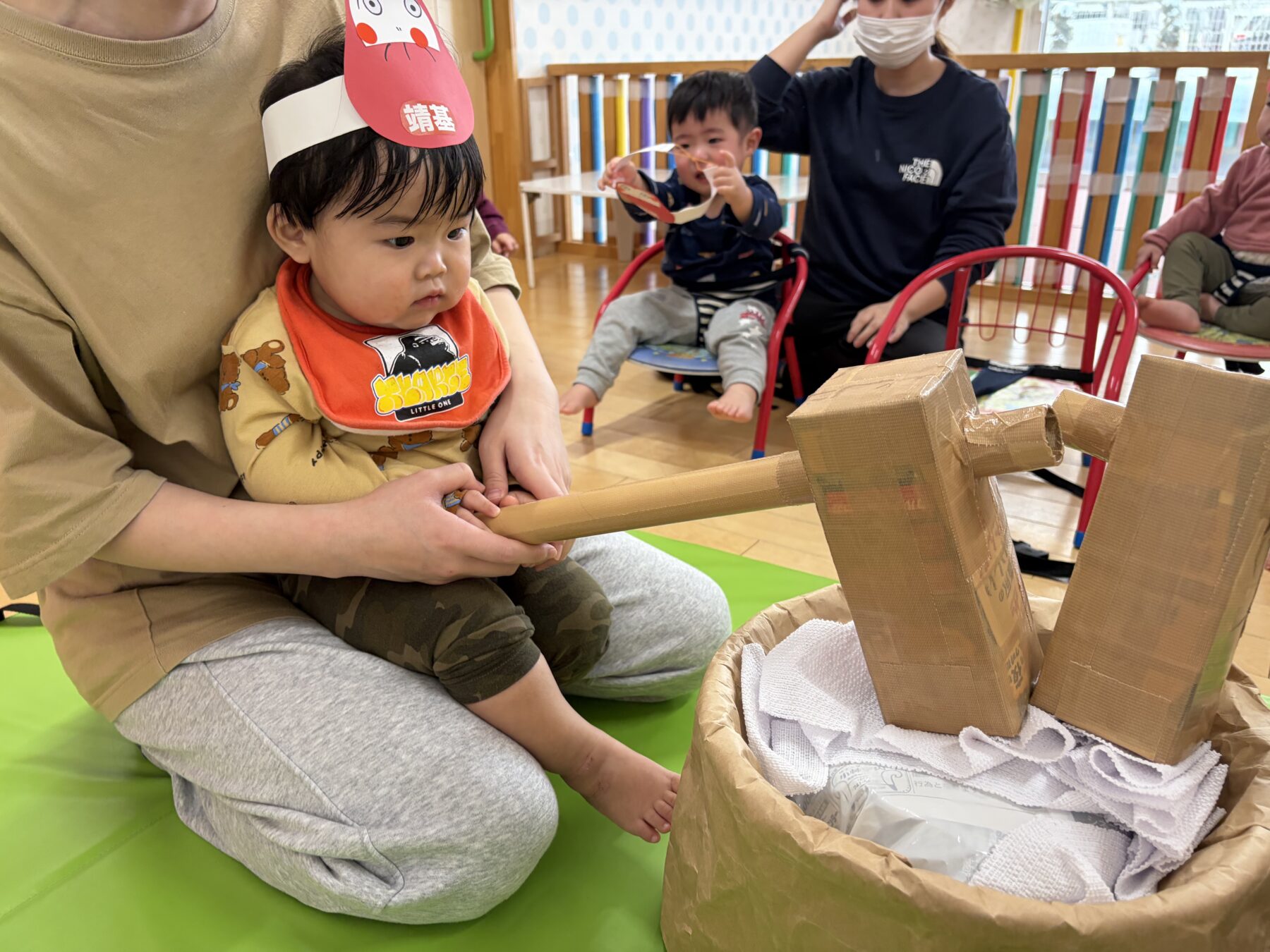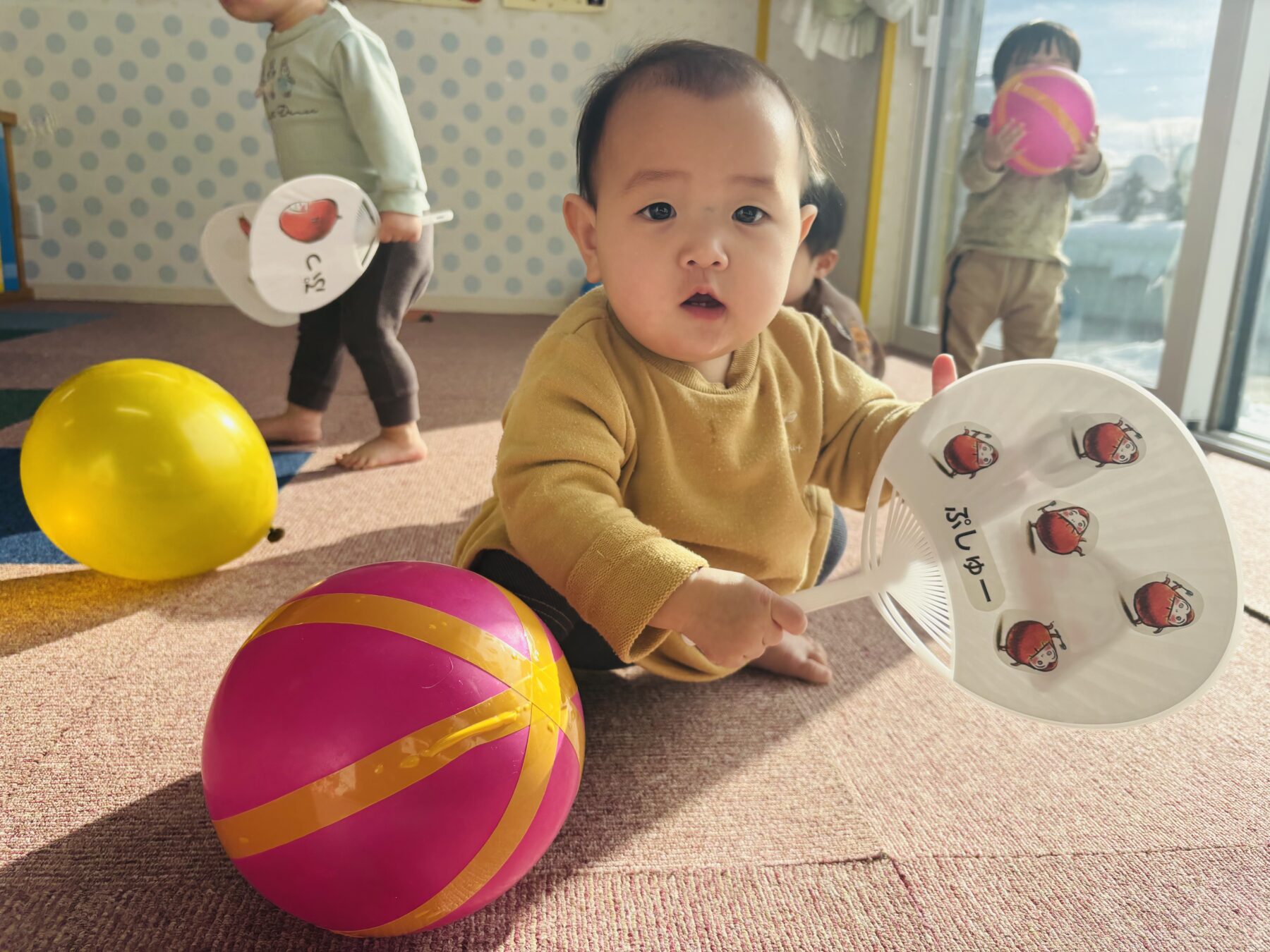 新年が明けて初めての登園ではちょっぴり泣いてしまった子。笑顔で登園した子。様々な姿が見られましたが、季節ならではのお正月遊びをたくさん取り入れると、小さいながらも全身で楽しむ様子が見られました。