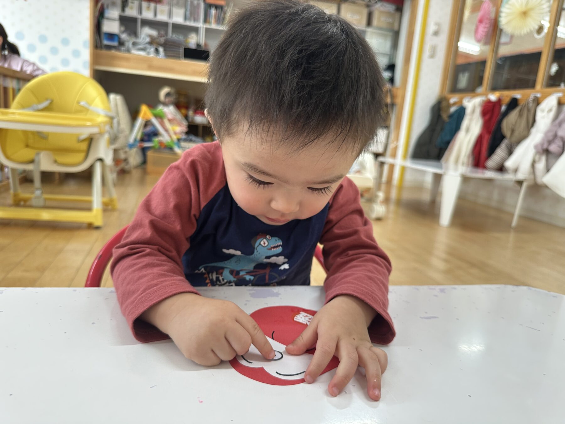 お面作りでは福笑いのように自由にシール貼りをしました。小さな手で一生懸命シールを貼る姿が可愛い過ぎますね😍