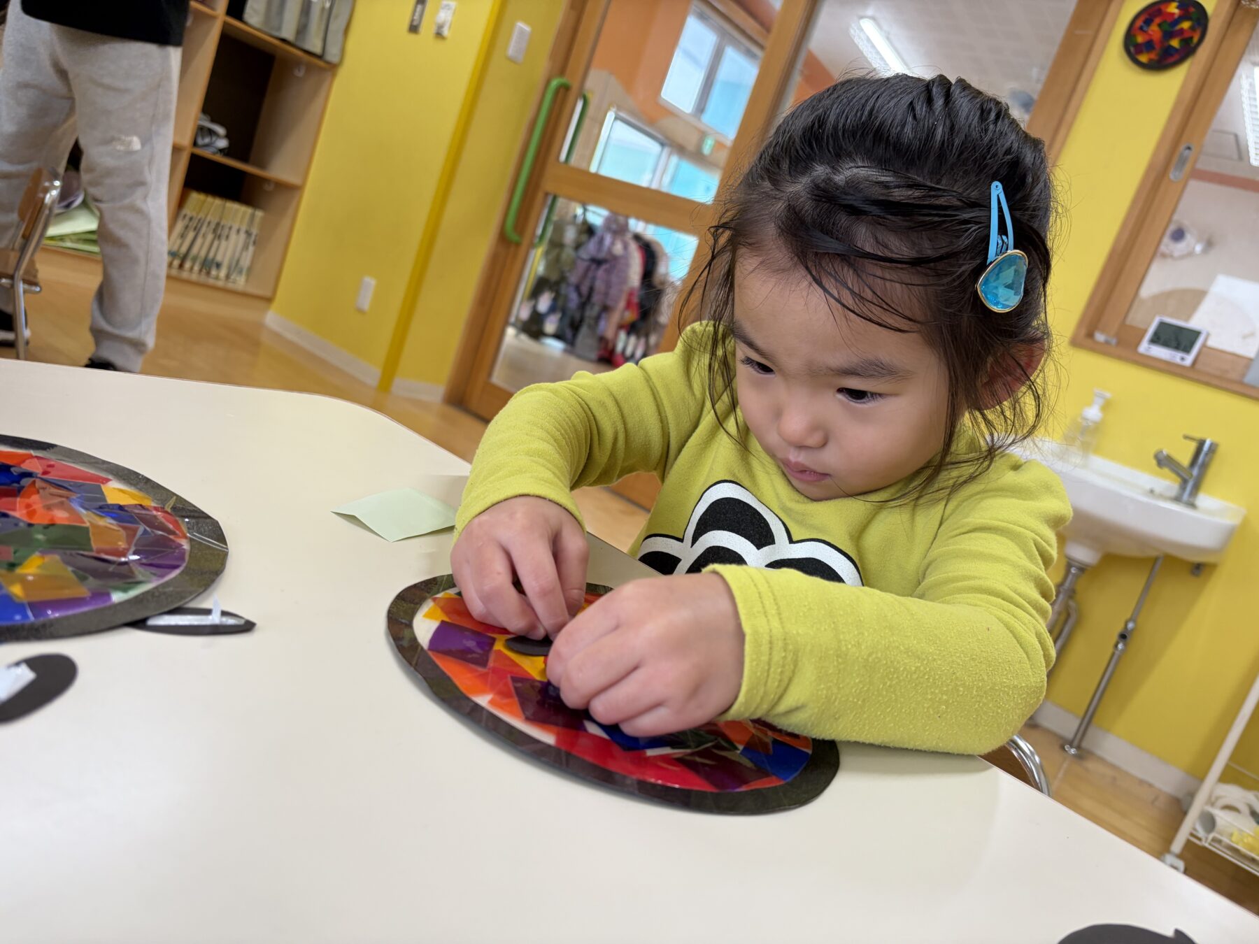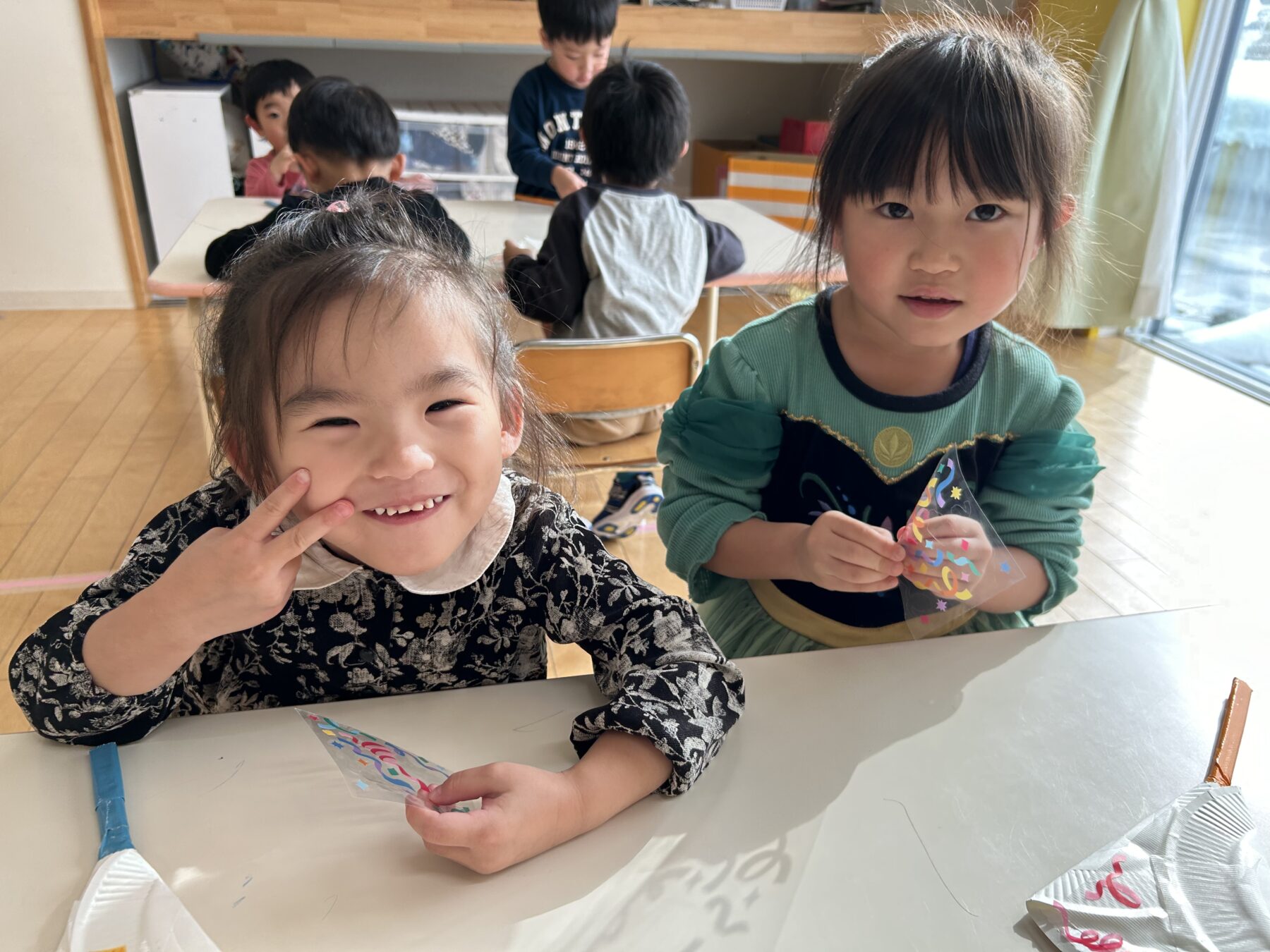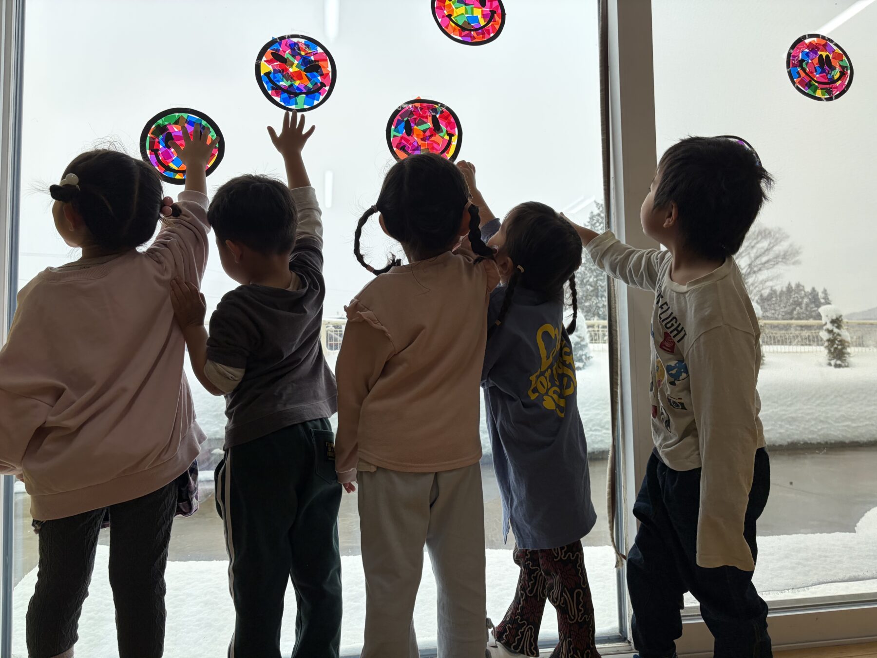 いろんな色のカラーセロハンを貼り、カラフルなニコニコマークが完成しましたよ♪