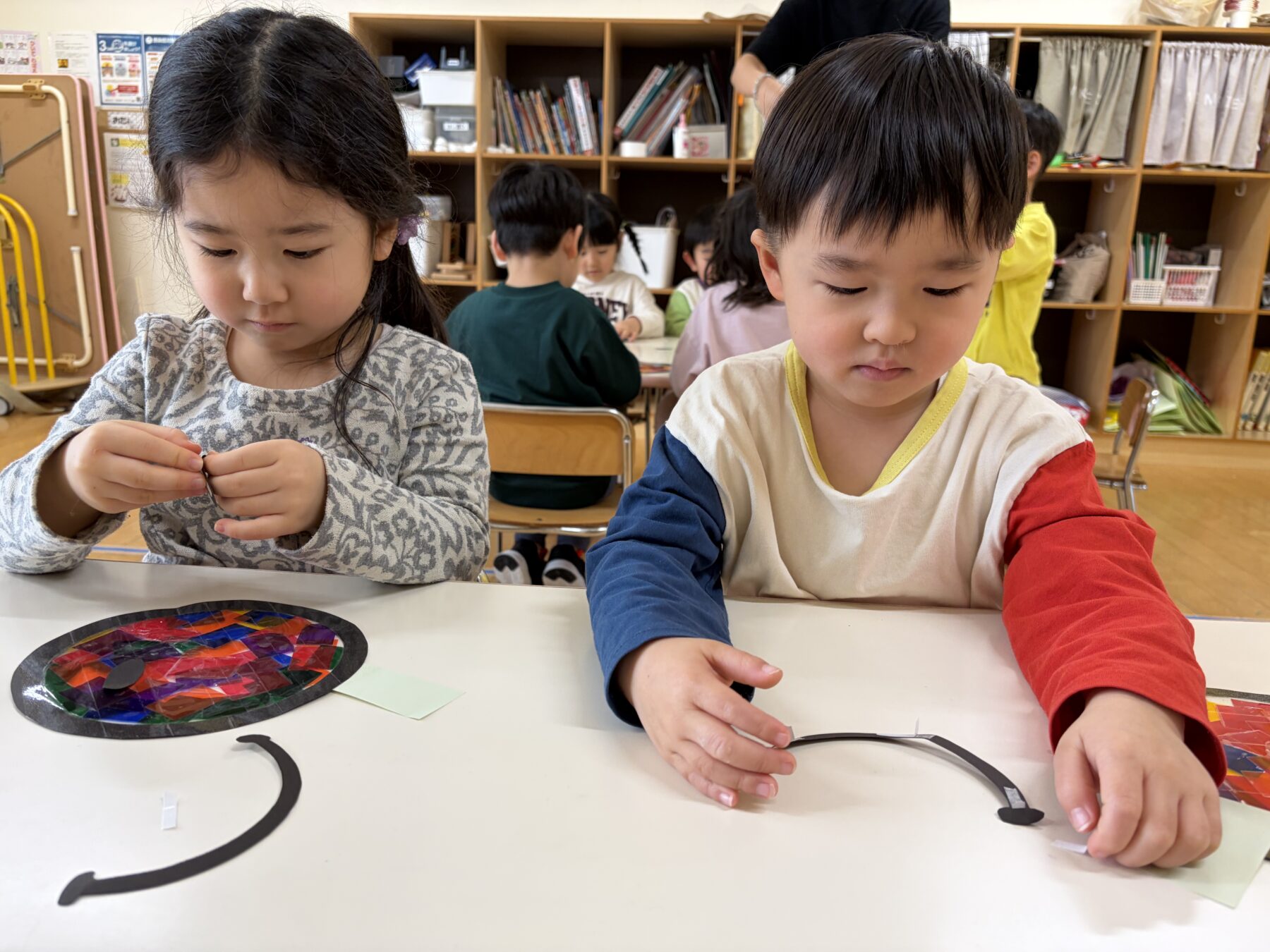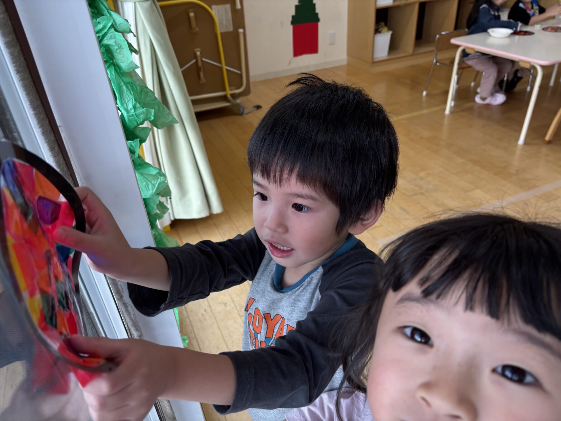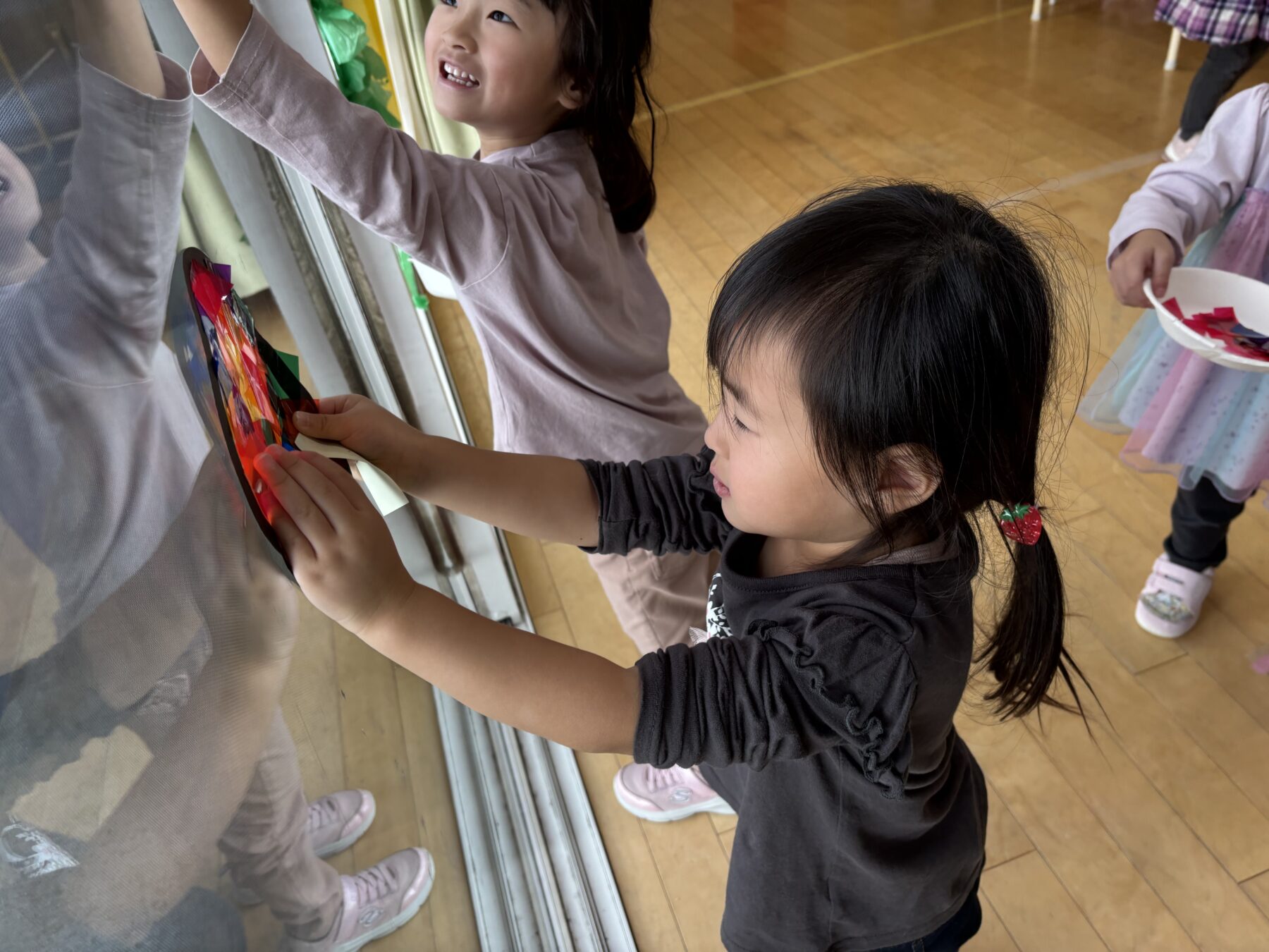 いろんな色のカラーセロハンを貼り、カラフルなニコニコマークが完成しましたよ♪