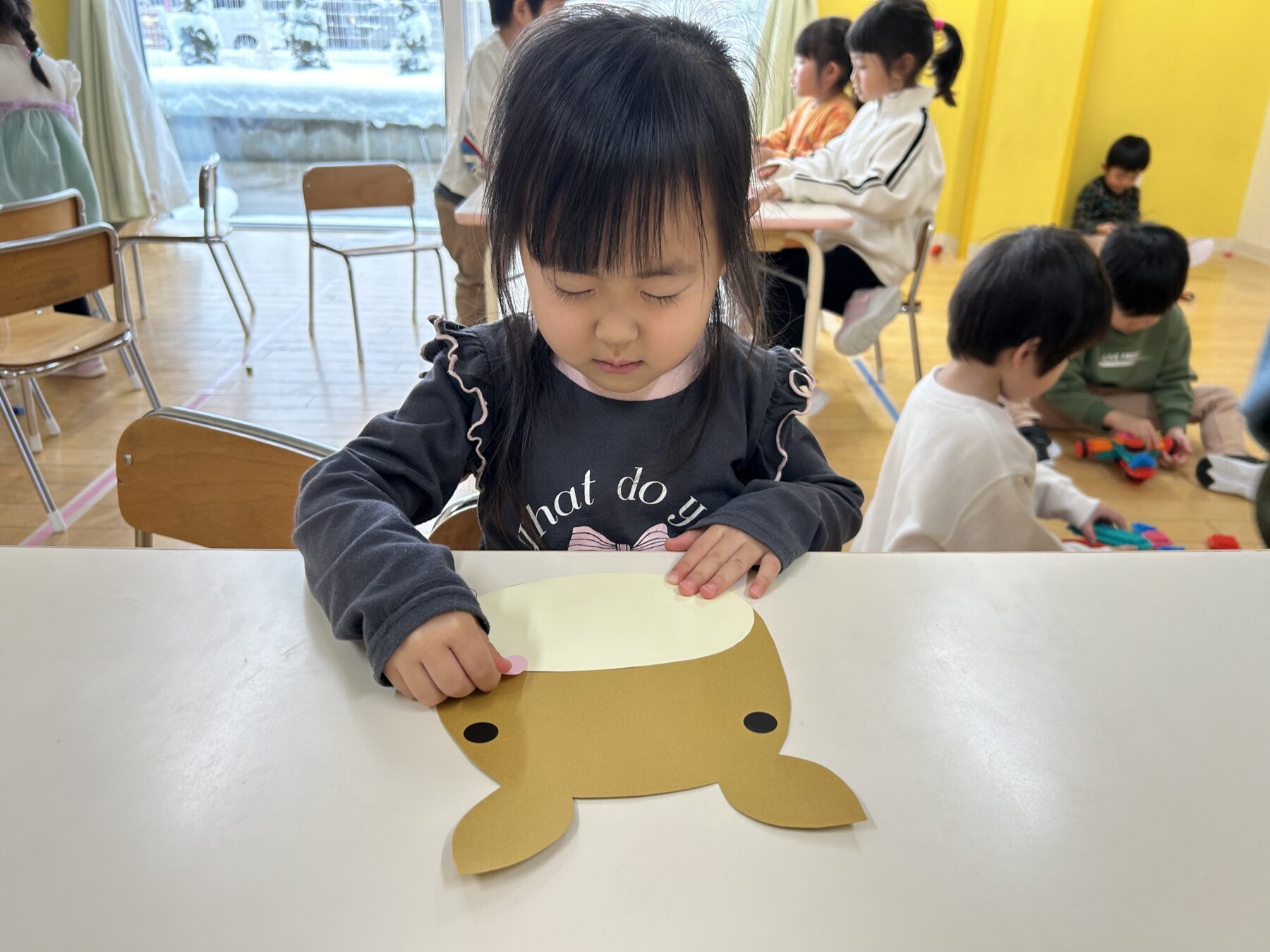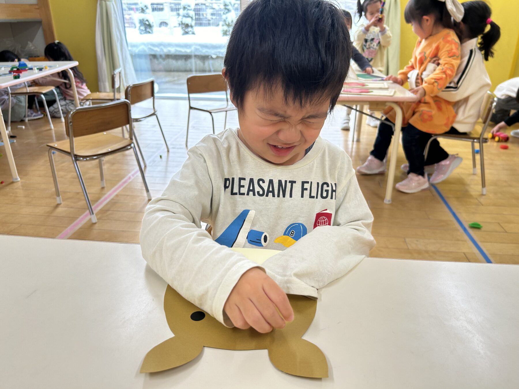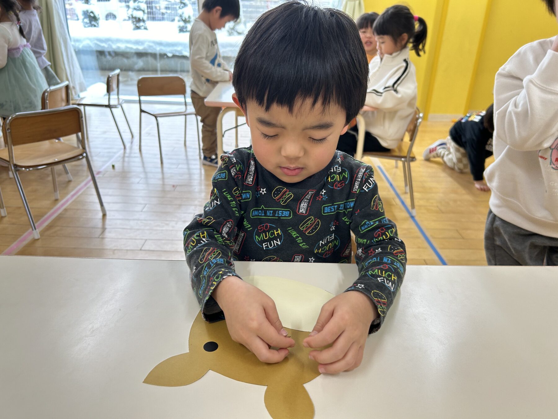 目をぎゅっと瞑って目やほっぺをシールで貼り